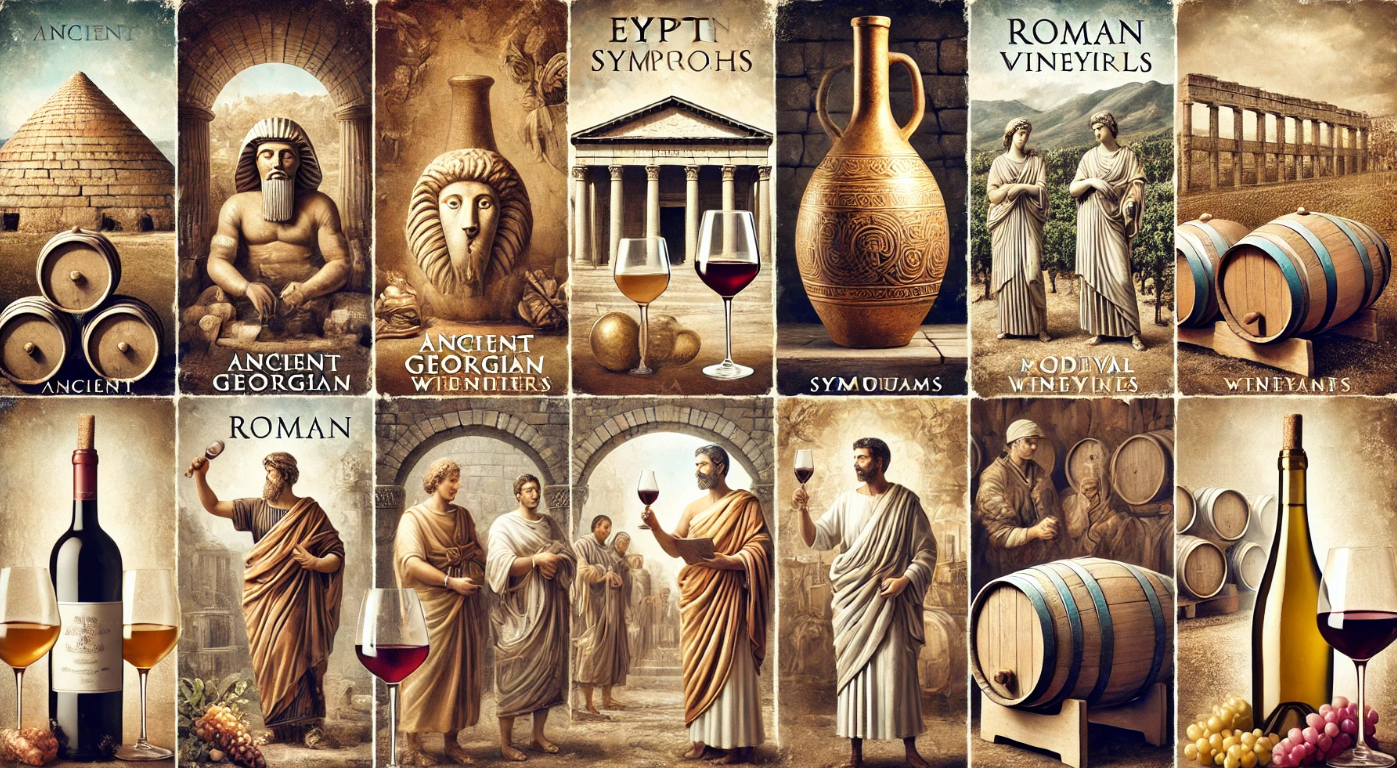 Die ältesten Beweise für Weinproduktion stammen aus Georgien, wo Archäologen Tonkrüge (Qvevris) mit Weinrückständen aus dem Jahr 6.000 v. Chr. fanden. Die alten Völker betrachteten Wein als Geschenk der Götter. In Mesopotamien war er den Königen und Priestern vorbehalten, und in Ägypten wurde er in Grabkammern als Wegbegleiter ins Jenseits gelegt.